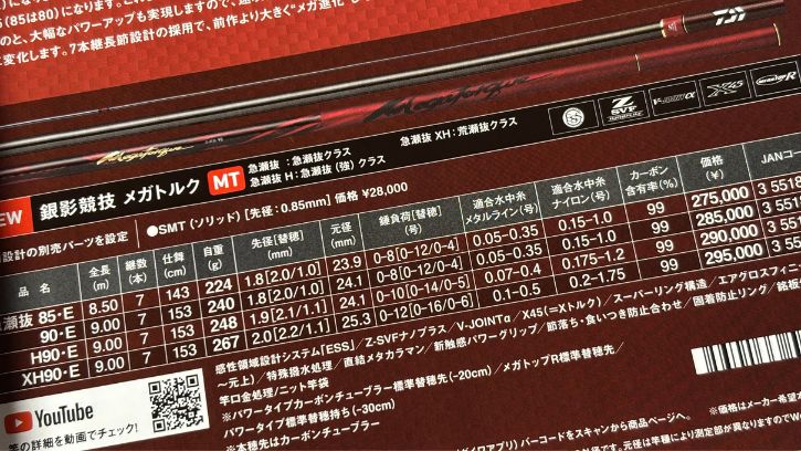 8代目銀影競技メガトルクは、「瀬の大鮎」を獲ることを目的とした竿です。そのため、パワー重視のラインナップが中心となっています。