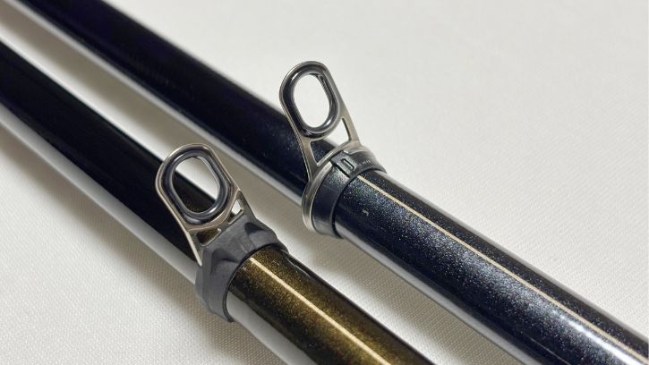 ガイドはチタン&カーボンハイブリッドフレームの「TC-IMガイド」を採用。軽快な竿操作を実現するのに一役買っています。一番大きな違いはパイプ部分が樹脂からカーボン強化樹脂に変更された点で、従来のIMガイドと比べて25〜46%の軽量化と25〜45%の強度アップを実現しています。
