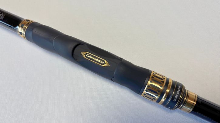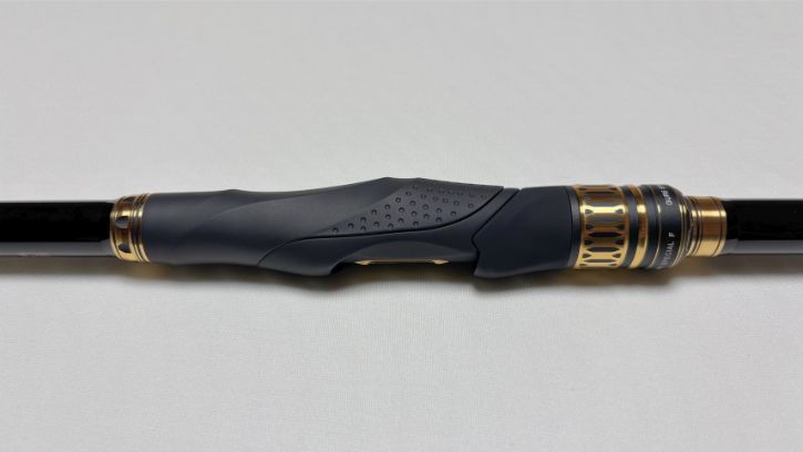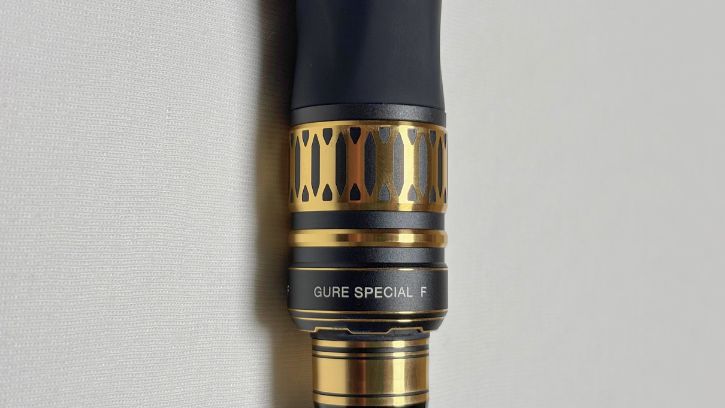 スクリュー部分はグレスペシャルFの専用デザインです。スクリュー部分のデザインは非常に凝った作りで高級感があります。リールシート部分のパーツも金色ですが、若干艶消しっぽい金色で竿全体を見た時のアクセントになっています。