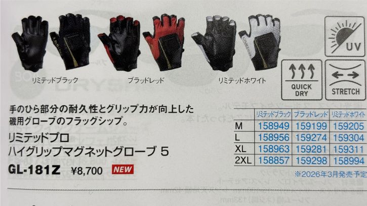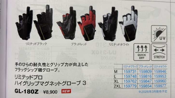 2026年3月リリース予定のシマノのハイエンドモデルのマグネットグローブ。3本切と5本切のタイプがラインナップされいて、カラーはブラック・レッド・ホワイトの3色となっています。