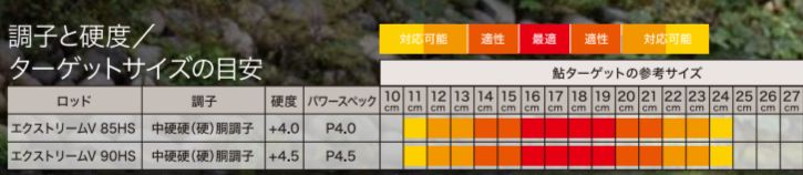 シモツケ独自の竿パワーを数値化したパワースペックでは、8.5mがP4.0、9.0mがP4.5と、9.0mの方がやや強めの設定です。
